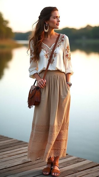 Туники, платья-макси, широкие брюки, юбки-миди и пончо — все это характерно для бохо.