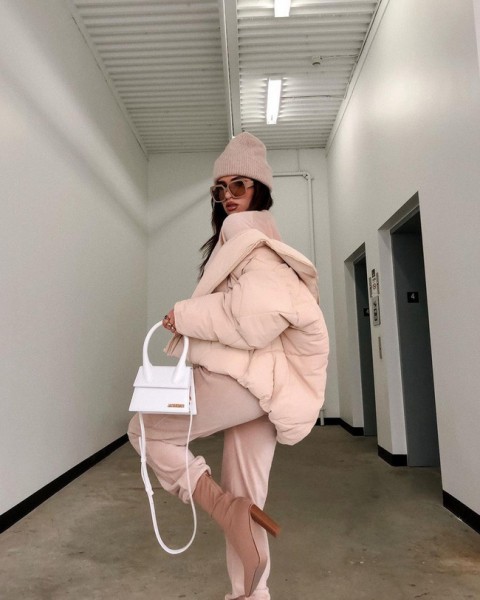 Универсальный пуховик выглядит стильно с джинсами, брюками, платьями и юбками. Но все же лучше всего дутая куртка сочетается с вещами в спортивном стиле. Высокие ботинки, тонкая шапка, кожаная сумка на цепочке дополнят образ.